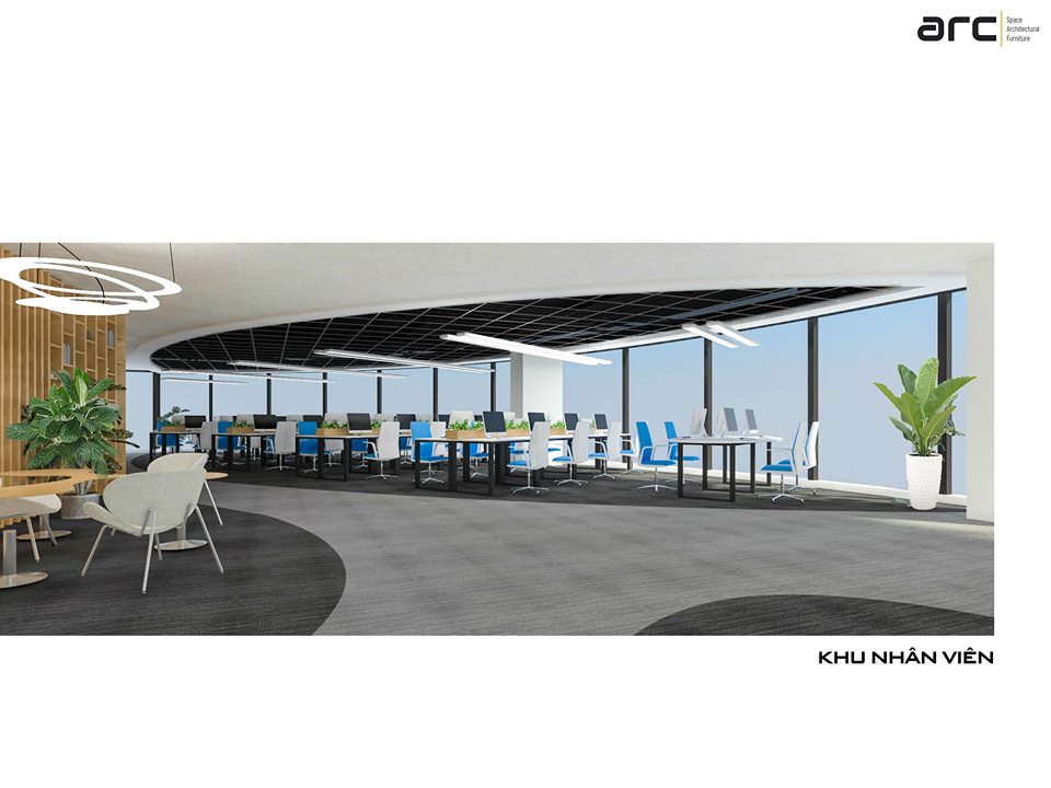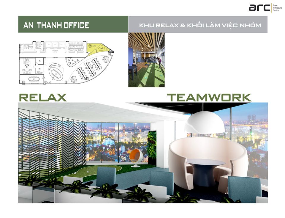 Khu Pantry đầy đủ tiện nghi, khu Relax thời thượng với sân golf mini phục vụ nhu cầu thư giãn giữa giờ, nghỉ ngơi, lấy lại năng lượng, sáng tạo. Chúng tôi không quên thêm yếu tố tự nhiên vào không gian, cây cối được bố trí hợp lý, đón ánh sáng tự nhiên, tạo không khí dịu mát.