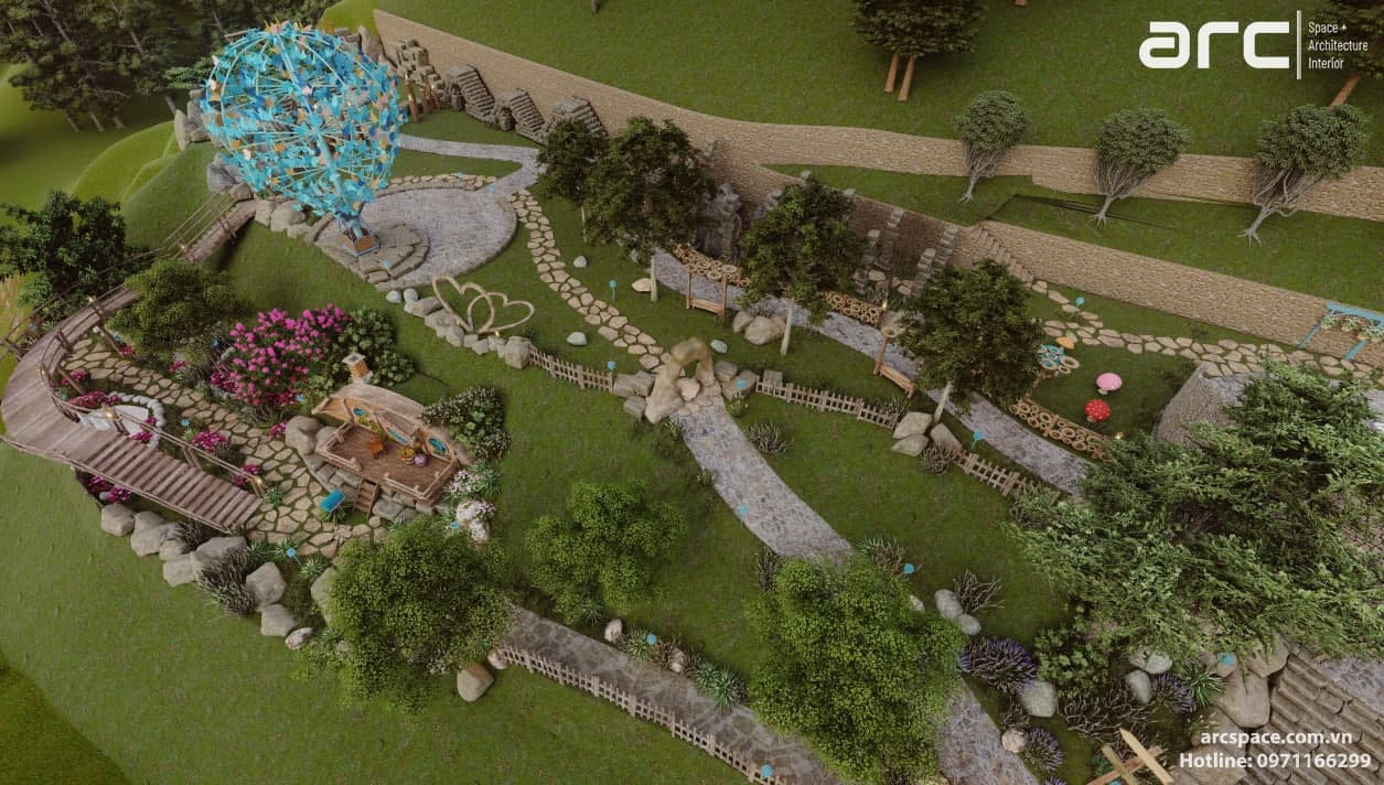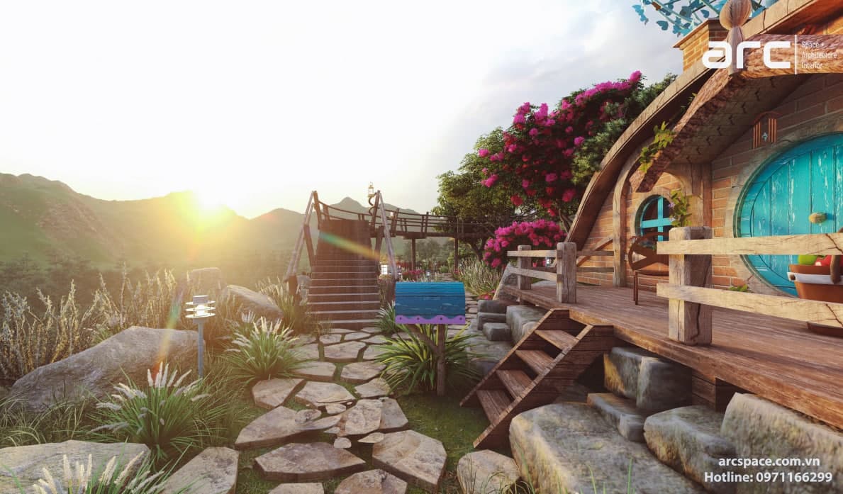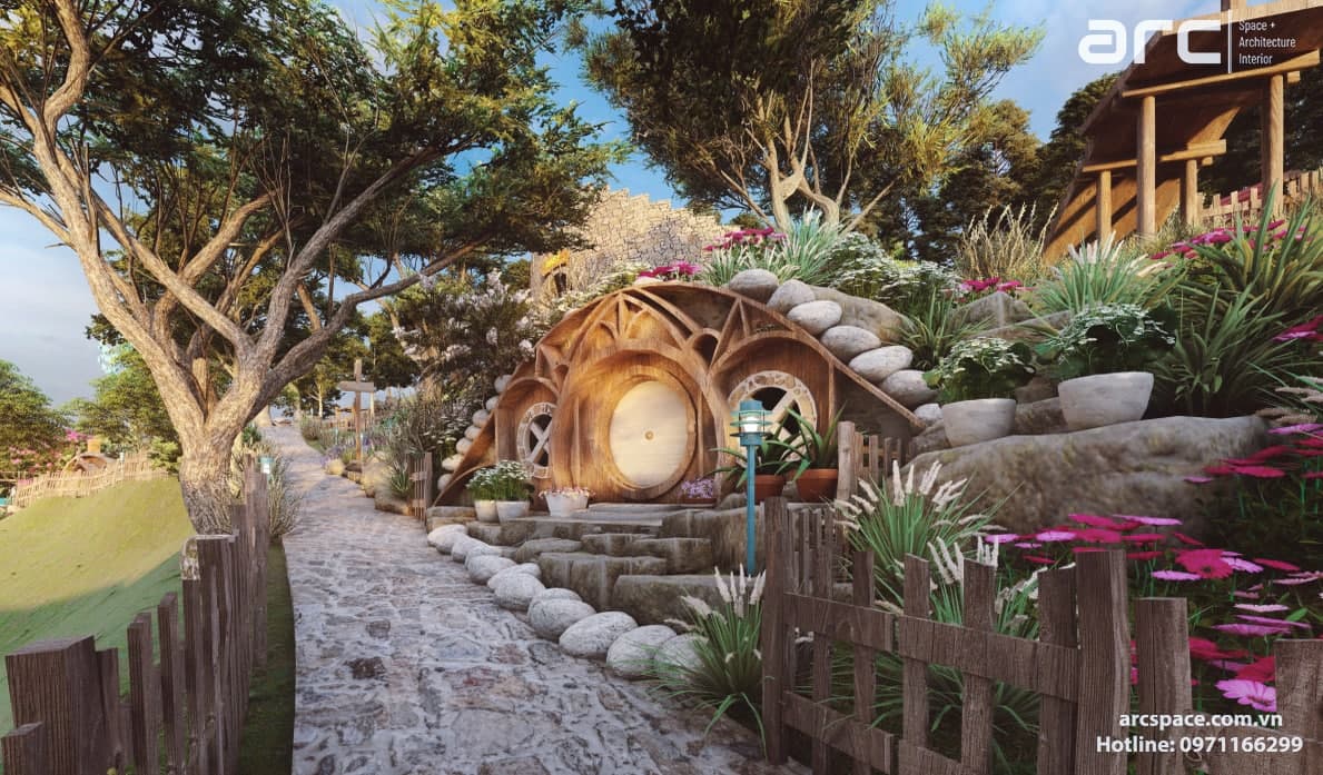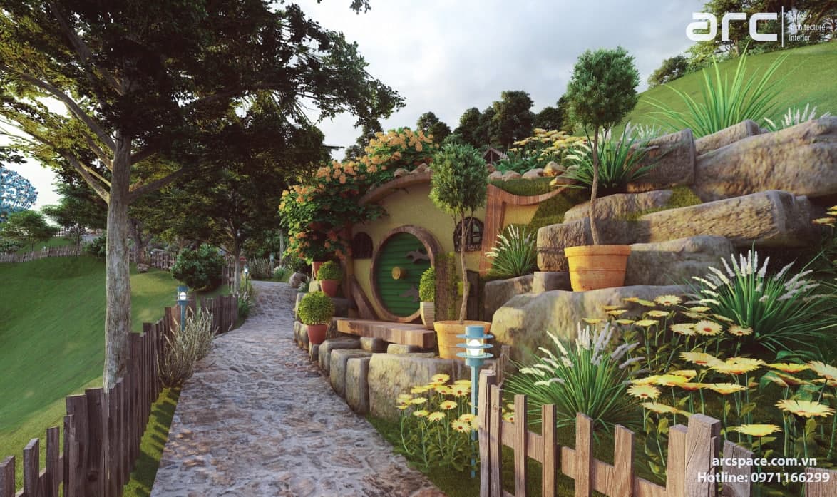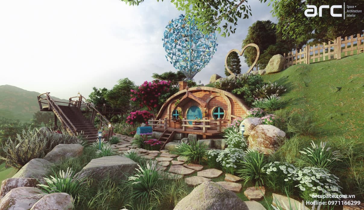 Cùng kiến trúc sư Đạt Trịnh của Arc Space dẫn mọi người vào khu cổ tích đầy thơ mộng này nhé, đi qua những ngôi nhà hobbit - nhà của người lùn đẹp nên thơ để vào khu quần thể check in siêu đỉnh. Tâm điểm dự án là quả khinh khí cầu siêu đỉnh cao 5m được hình thành bởi những con bớm đang tung cánh bay. Tâm điểm không thể bỏ qua thứ hai là mặt nước đồng hồ với những bông hoa cúc tượng trưng cho 12h. Lấy ý tưởng từ tên dự án do chủ đầu tư đặt là Daisy, kiến trúc sư của chúng tôi đã nghĩ ra ý tưởng về mặt đồng hồ nước này. Còn rất nhiều điều hay ho trong dự án này, hãy cùng Arc Space ngắm nghía dự án siêu đỉnh này nhé