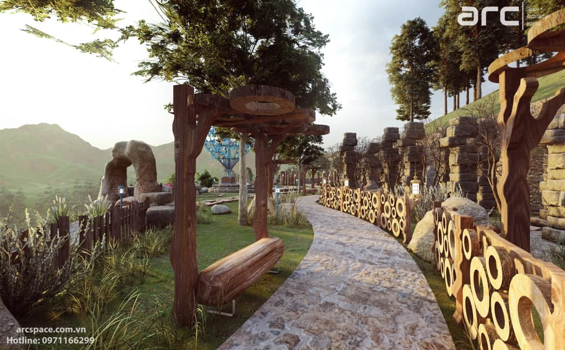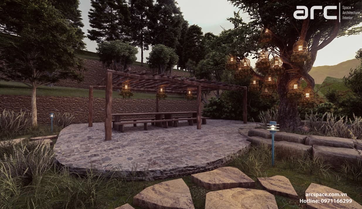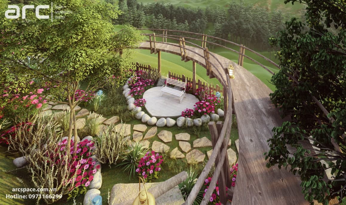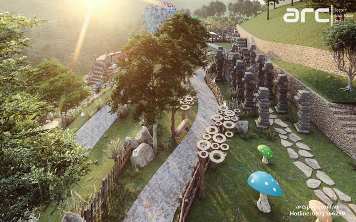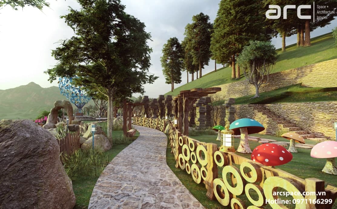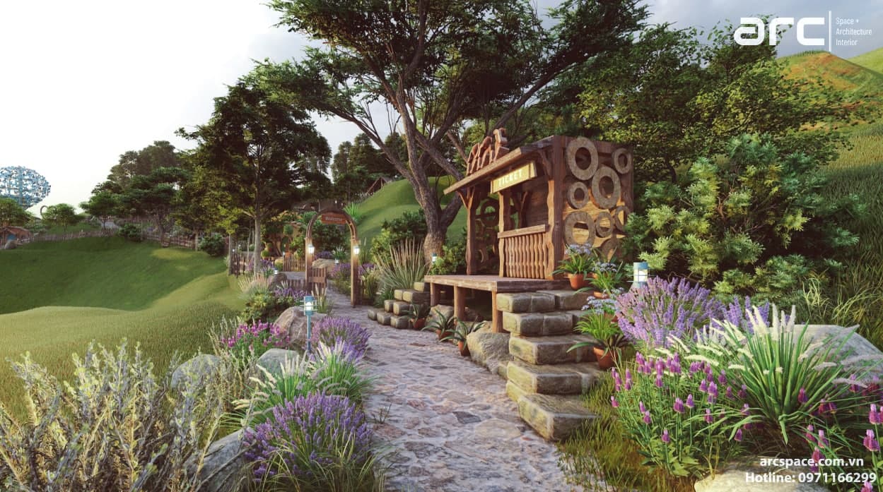 Cùng kiến trúc sư Đạt Trịnh của Arc Space dẫn mọi người vào khu cổ tích đầy thơ mộng này nhé, đi qua những ngôi nhà hobbit - nhà của người lùn đẹp nên thơ để vào khu quần thể check in siêu đỉnh. Tâm điểm dự án là quả khinh khí cầu siêu đỉnh cao 5m được hình thành bởi những con bớm đang tung cánh bay. Tâm điểm không thể bỏ qua thứ hai là mặt nước đồng hồ với những bông hoa cúc tượng trưng cho 12h. Lấy ý tưởng từ tên dự án do chủ đầu tư đặt là Daisy, kiến trúc sư của chúng tôi đã nghĩ ra ý tưởng về mặt đồng hồ nước này. Còn rất nhiều điều hay ho trong dự án này, hãy cùng Arc Space ngắm nghía dự án siêu đỉnh này nhé
